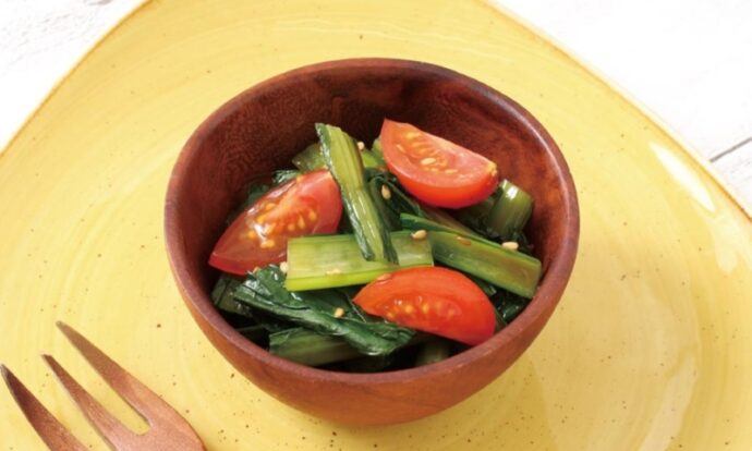小松菜は熱湯で茹でて水気を絞り、2cm幅のざく切りにする。ミニトマトは4等分に切る。