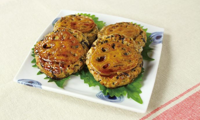フライパンに油を熱し、れんこんの面を下にして並べ入れて焼く。れんこんにこんがりと焼き色がついたら返して弱火にし、蓋をして4~5分蒸し焼きにして火を通す。Aを加えて煮立ててからめる。器におおばをしき、盛り付ける。