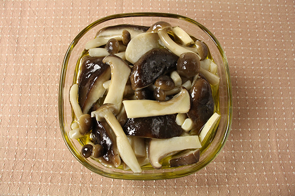 鍋に湯を沸かし、①、しめじを入れて再び沸騰したら1分茹でて火を通し、ざるにあげて湯をきる。耐熱容器に、にんにくと塩を入れて混ぜる。きのこ類を熱いうちに入れて、かぶるくらいのオリーブ油を注ぐ。