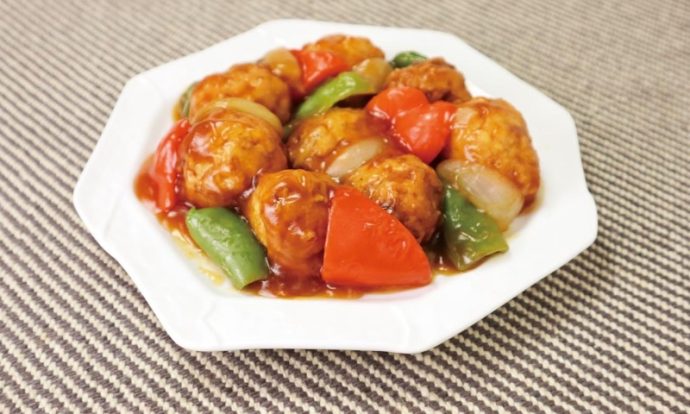 フライパンに油を熱し、たまねぎを炒め、しんなりしてきたら赤パプリカ、ピーマンを加えて炒め火を通す。鶏団子とAを加えて混ぜ合わせ、トロミがついたら火を止める。